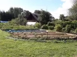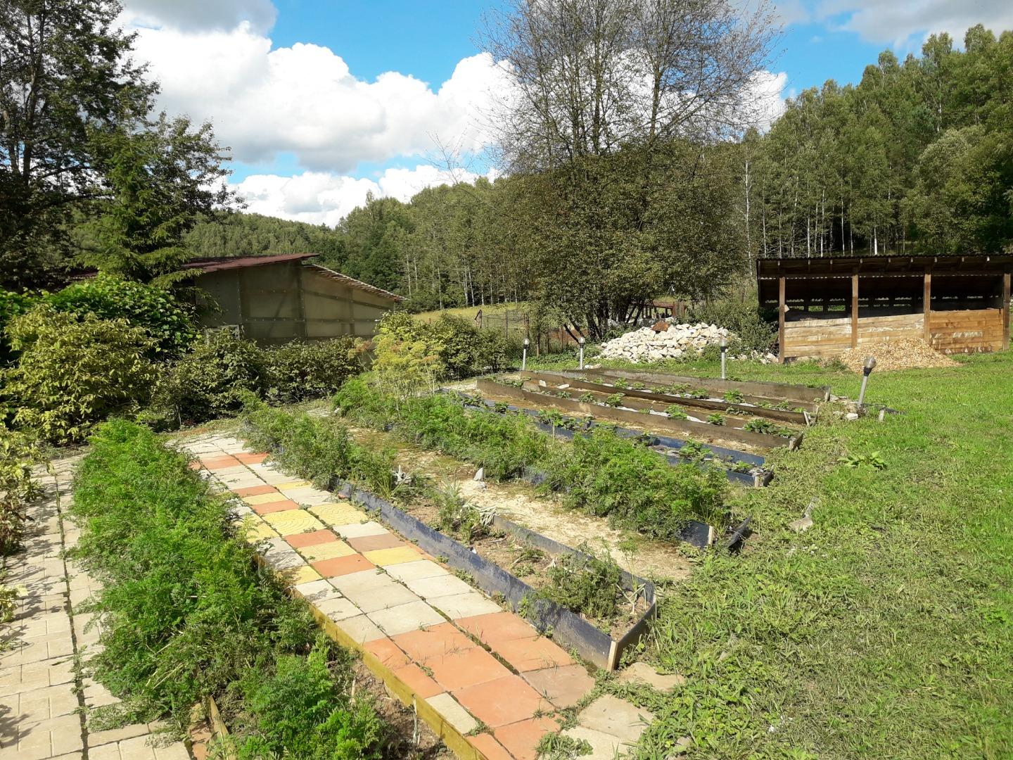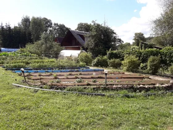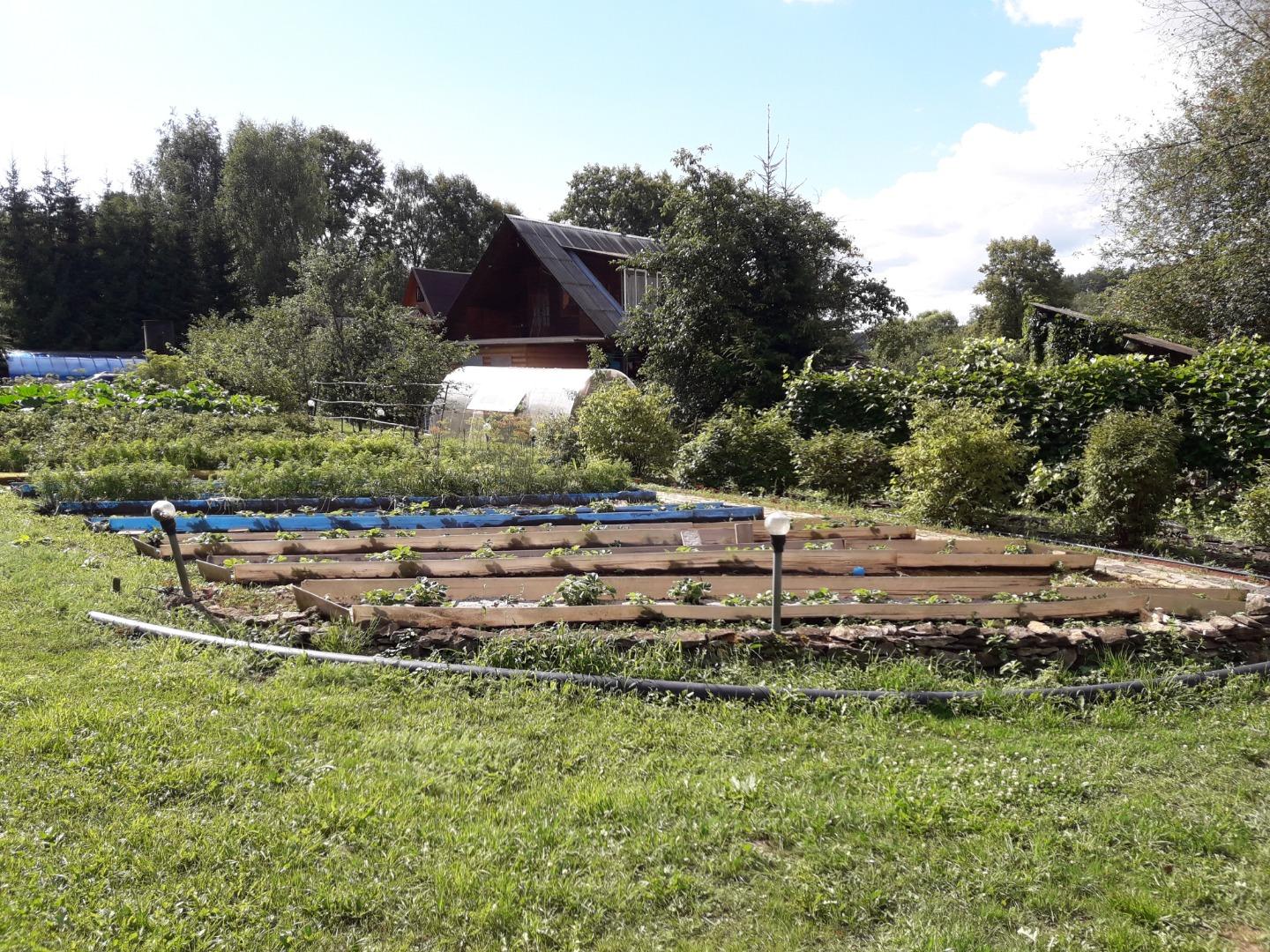 Грядки, 24 шт 0,5х6,5 м с проходами 1 м (по Митлайдеру), что позволяет без проблем соблюдать севооборот. В каждой грядке находится труба для корневого полива с краном. Вода нагревается в емкости с автоматическим наполнением и теплой, с помощью насосной станции, доставляется к открытым кранам для полива. Междурядья уложены тротуарной плиткой. Переставные дуги для парника (количество на 3 парника, высотой 1,2-1,5 м) также способствуют соблюдению севооборота;