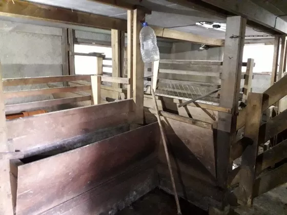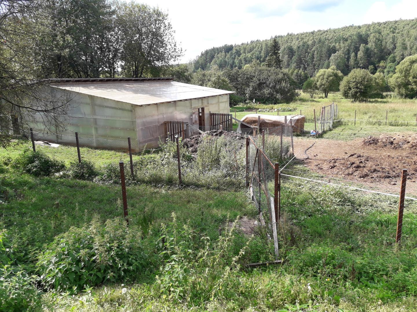 Овчарня 6х12 м2, установлена на "шведской плите" с теплым полом из котельной, утепленная, с помещением для зимнего забоя овец и птицы, круглогодичным водоснабжением, птичником для вывода птенцов и содержания перепелов, отделением для коз, дойки, для ягнят, овцематок, отдельные стойла для баранов. Имеет бетонный пол с уклоном и отведением сточных вод и фекалий в закопанную вне овчарни емкость (два кольца диаметром 2 м). С внешней стороны имеется крольчатник с зимнем водоснабжением (вода подогревается и циркулирует по клеткам), с отводом фекалий в вышеописанную емкость. Имеются навесные маточные ящики (по последнему слову кролиководства). Также с внешней стороны вход в отдельные два хозяйственных помещения и большой склад комбикормов. Имеются весы для взвешивания овец, станок для стрижки и проч.;