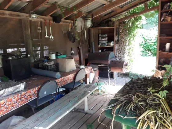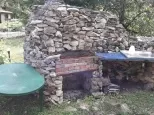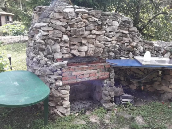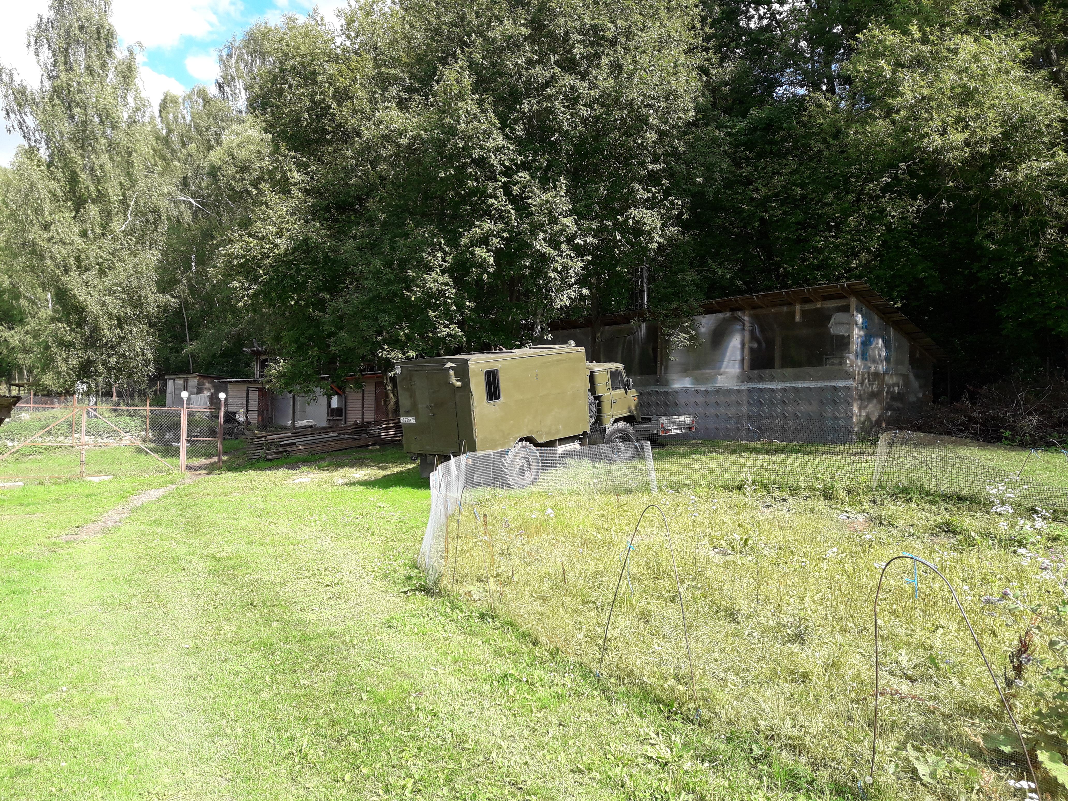Площадка с навесом 3х6 м2 (большой стол 3 м с закрытыми встроенными минимангалами, как в Японии; деревянным полом, псевдо-квадро система, поленницей с дровами плодовых деревьев для мангала. На площадке зоны барбекю, коптильня-автомат для холодного и горячего копчения, с датчиками температуры как внутри коптильни, так и внутри тушки (всего 7 датчиков) и передачей информации по блютуз. Оснащена дымо- и парогенератором.